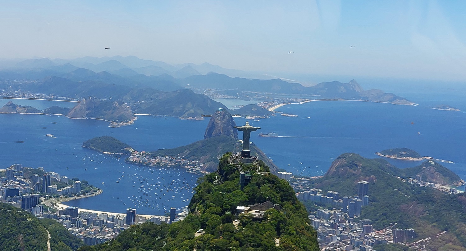 Then, the engine noise seems to fade into the background as we approach Corcovado. This was the moment that felt truly eerie. We didn’t just fly past; we circulated the statue. It is one thing to see the Christ from the streets of Botafogo, but it is entirely another to be at eye-level with those 28-meter-wide outstretched arms. It felt surreal—almost like the helicopter was caught in a gravitational pull. As we banked in a slow, tight circle, I could see the individual soapstone tiles (millions of them) that cover the statue’s skin. For a few seconds, it felt like time stopped. You are suspended between the blue of the Atlantic and the white of the stone, looking directly into the face of an icon that has watched over Rio since 1931. To be that close, hearing the wind and the rotors, feeling the tilt of the helicopter as it “bows” to the statue, you realize why they call this the Cidade Maravilhosa.